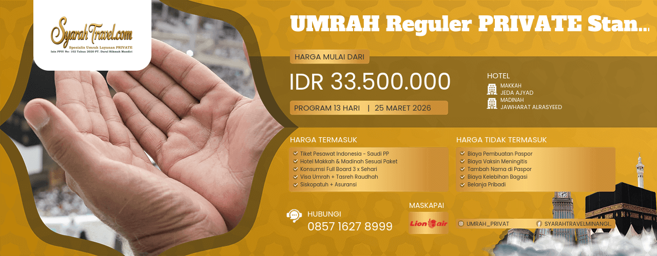 Syarah Travel; Spesialist Umrah Layanan PRIVATE merupakan salah satu Branding Travel Umrah PT. Darul Hikmah Mandiri yang sudah mendapatkan izin Peneyelenggara Perjalanan Ibadah Umrah dari Kementerian Agama Republik Indonesia dengan nomor Izin PPIU Nomor: U.102 Tahun 2020. Syarah Travel; Spesialist Umrah Layanan PRIVATE merupakan perusahaan resmi dan legal yang bergerak dalam bidang Pelayanan dan Pemasaran Paket Perjalanan Ibadah Umrah dan Perjalanan Wisata Domestik & Internasional. Syarah Travel memposisikan diri sebagai Perusahaan yang Amanah, Terpercaya dan Profesional dalam memberikan Pelayanan perjalanan Ibadah Umrah dan Wisata yang berorientasi kepada Kepuasan Jamaah, Wisatawan & Pelanggan.