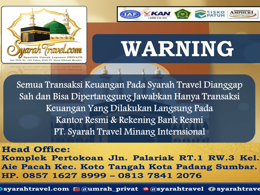 - Semua Pembayaran Biaya PIU Dianggap Sah Hanya Yang Ditransfer Ke Rekening Resmi PT. Syarah Travel Minang Internasional.